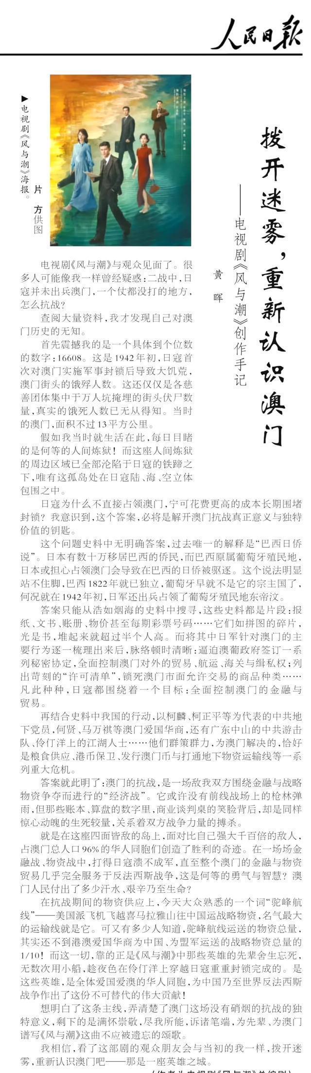 《风与潮》,为澳门正名,为英雄立传,为人民铸史,为国家传道。