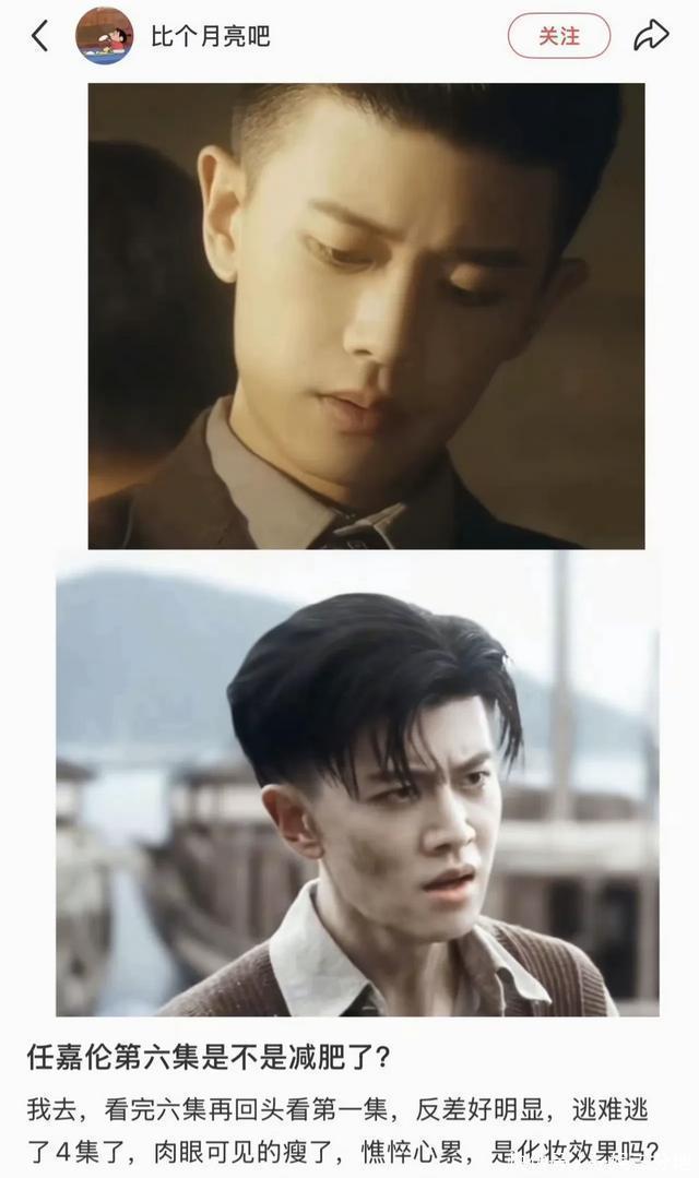 就是说,逃难衣服还在,但没钱买吃的,演员看到了本质现象,所以特意控制了体重,让观众相信何贤饿瘦了。 演员为角色服务没错,偶像包袱的帽子扣在任嘉伦这里实属有点冤,前段时间还看到这哥为新剧剃了寸头。